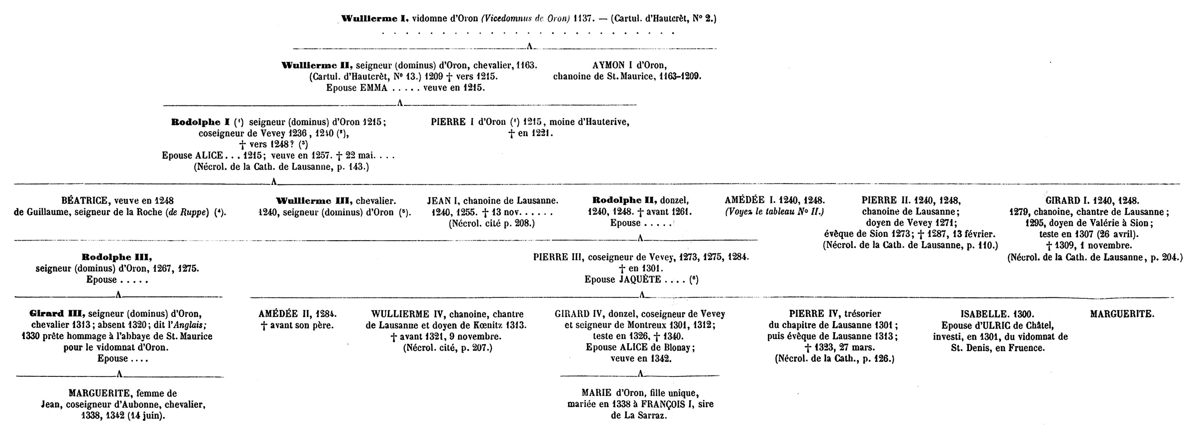 5 D’après un acte de donation au couvent de Hauterive, cité par Castella (Notes généalogiques), sous l’an 1248, dans lequel paraissent tous les enfants vivants, ainsi que la veuve de Rodolphe I, seigneur d’Oron (déjà mort à cette date, si celle-ci est exacte), à l’exception de Wullierme, chevalier, l'aîné des six fils du défunt; on doit en conclure que celui-ci était absent, et qu’il mourut bientôt après sans lignée et avant le partage de l’héritage paternel, la seigneurie d'Oron et la coseigneurie de Vevey ayant passé à Rodolphe II, troisième fils de Rodolphe I.