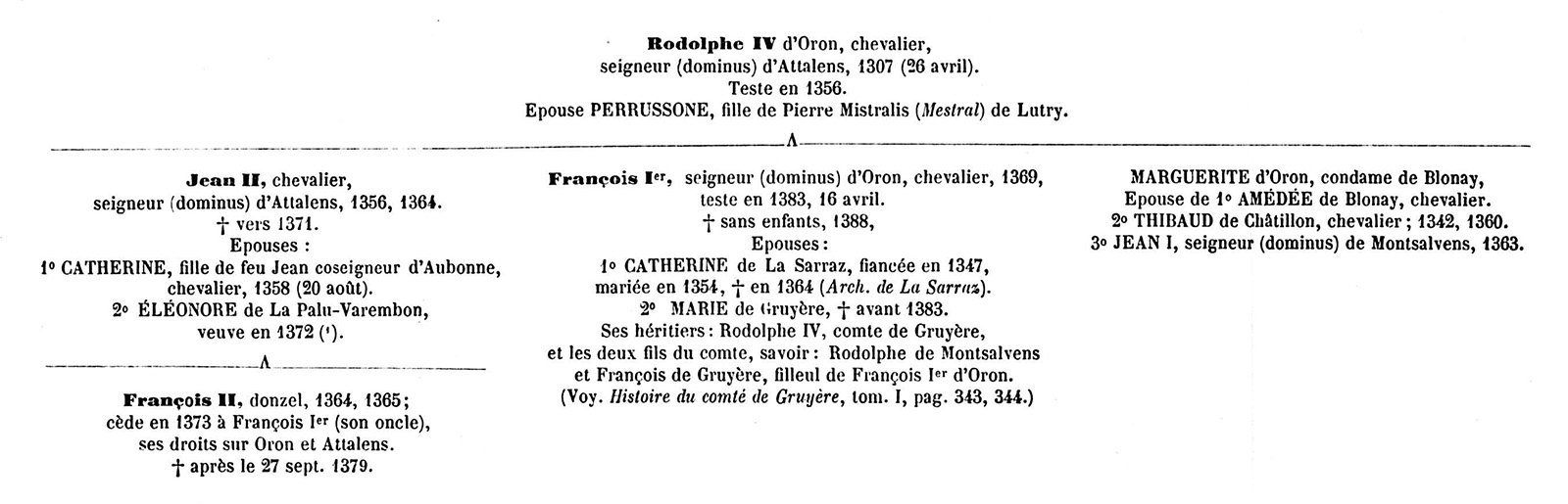 1 Eléonore (soit Elyone) de La Palu-Varembon (fille de Pierre de La Palu et d’Eléonore de Cossonay?), veuve de Jean d’Oron, chevalier, coseigneur d’Attalens, épousa noble Jean de Mont, dont elle avait, en 1374, un fils, nommé Arthaud.