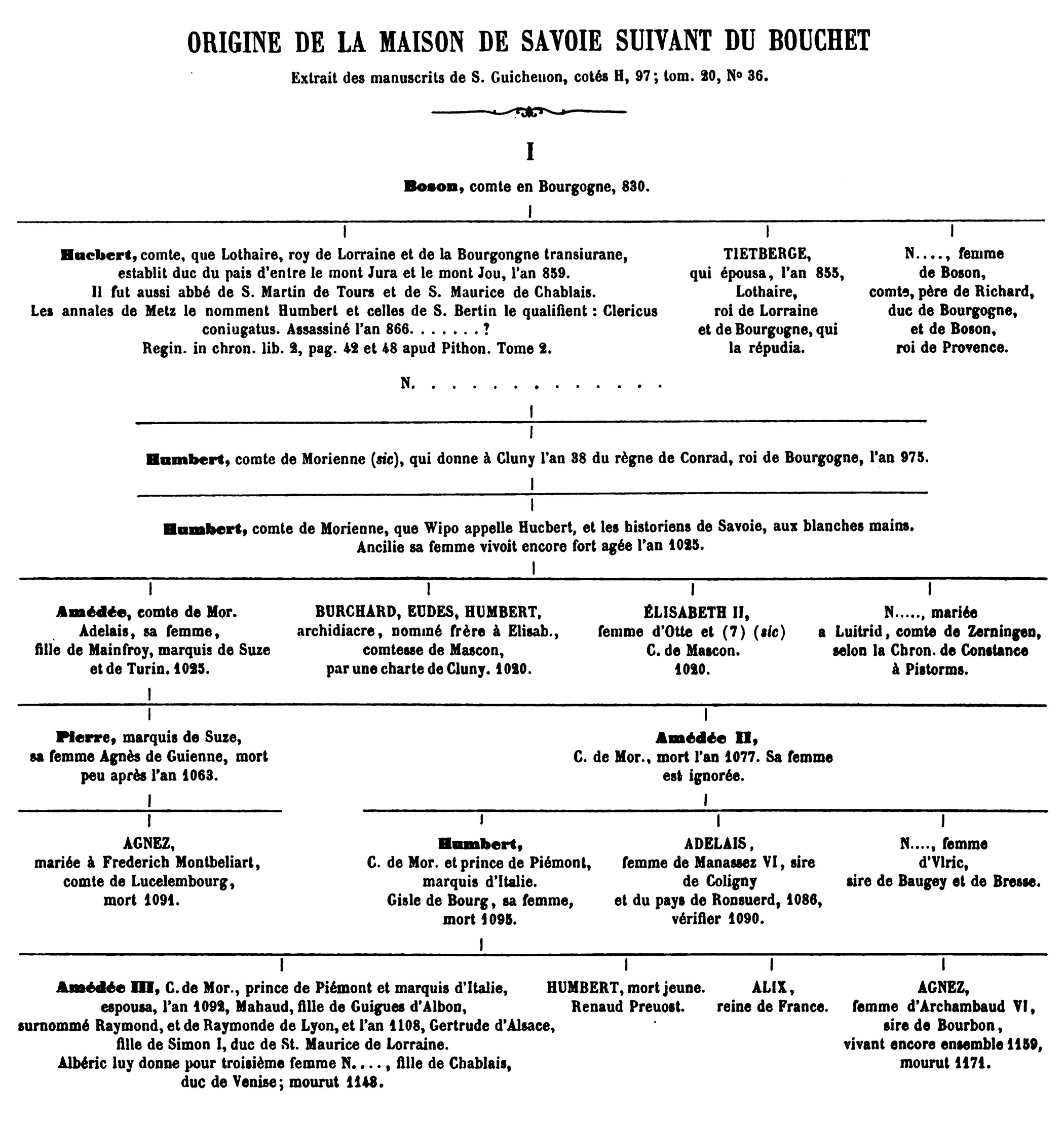 En supposant même que, par suite du vandalisme révolutionnaire, on ne parvînt pas à retrouver les documents nécessaires pour compléter les preuves diplomatiques de tous les degrés intermédiaires entre Humbert aux blanches mains et le prince Charles Constantin, on pourrait y suppléer par une suite de présomptions tirées de la possession de certaines propriétés domaniales qui passèrent de la maison des princes de Vienne dans celle des comtes de Savoie par succession héréditaire et patrimoniale. La découverte du titre unique qui prouve directement que le marquis Odon était réellement fils du comte Humbert Ier est relativement très récente; toutefois personne ne contestait ce fait, quoiqu’il ne fût attesté que par un concours de preuves indirectes. De longues recherches, entreprises dans le but de réunir tous les matériaux d’une histoire des deux royaumes de Bourgogne cis et transjurane, ont procuré à l’écrivain plusieurs documents importants qui se rapportent au même système proposé par Du Bouchet et reproduit dans les tables généalogiques de Chazot de Nantigny et de Las Casaz, sauf les rectifications essentielles qui résultent de la teneur même de ces documents.