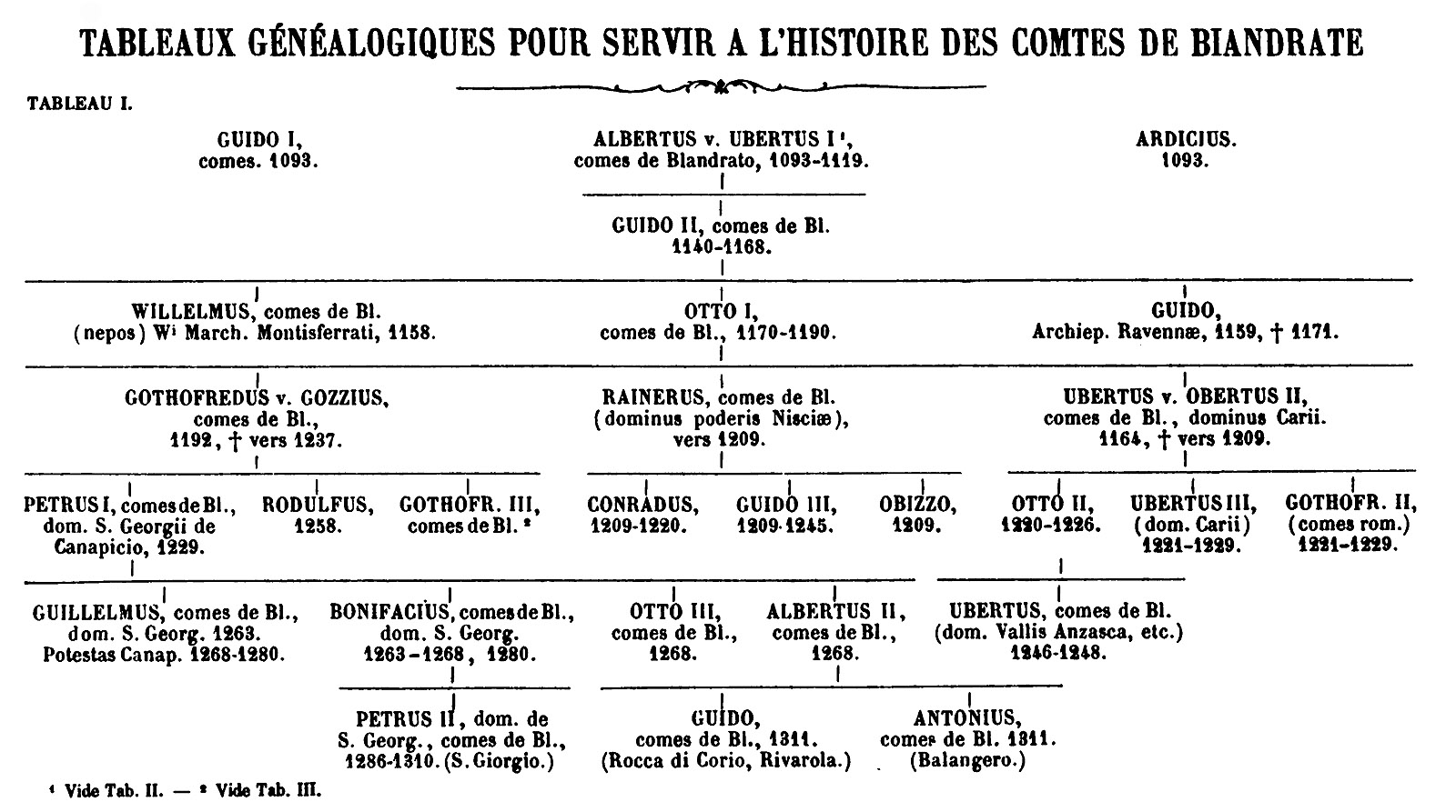 Dès le XIIe siècle, la maison de Biandrate se trouve étroitement unie à la première dynastie de Montferrat; on les voit s’élever, grandir ensemble, quand la fortune les seconde, et partager les mêmes revers lorsque la faction impériale a le dessous.