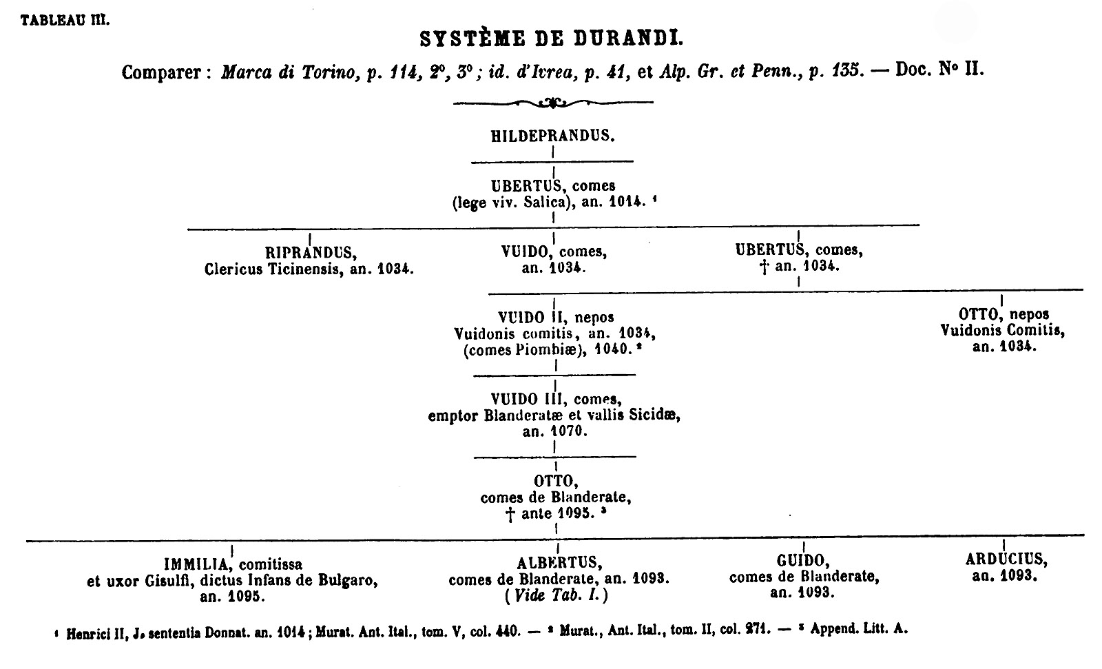 Aux divers systèmes sur l’origine des comtes de Biandrate qui ont été mentionnés, soit dans le mémoire qui précède, soit dans l’Appendice litt. A, il faut joindre celui que J. Durandi n’a fait qu’indiquer dans ses ouvrages imprimés. (Marc. d’Ivr.,chap. VI, pag. 41.) Cet auteur s’appuie sur un document de la seconde moitié du XIe siècle, dont il résulte que le bourg de Biandrate (Blanderade) et les terres de la Val-Sésia /472/ (vallis Sesedana), soit Borgosésia, Varallo, Rocca, Quarone, etc., après avoir passé dans les mains de différents seigneurs pendant le cours de ce siècle, furent acquis en 1070 par un comte Guido ou Vuido, qui lui-même était fils d’un comte nommé aussi Vuido, possesseur du comté de Piombia dans le Novarais, vers l’an 1040. (Durandi, Marc. di Torino, pag. 114, note 3, et Alpi Gr. et Pen., pag. 135, Doc. N° 2.) Guido, acquéreur de la seigneurie de Biandrate, eut pour successeur Otton (Otto comes de Blanderata), dont la fille Immilia, femme d’un comte de Bulgaria, fit une donation à l’église de Verceil en 1095. (Charte citée, Append. litt. A.) Otton était déjà décédé à cette date, il peut avoir été père d’Albert et de Guido, comtes de Biandrate, qui gouvernèrent en commun en 1093, et dont le premier forma la tige certaine de cette illustre maison. (Voyez le tableau N° III.)