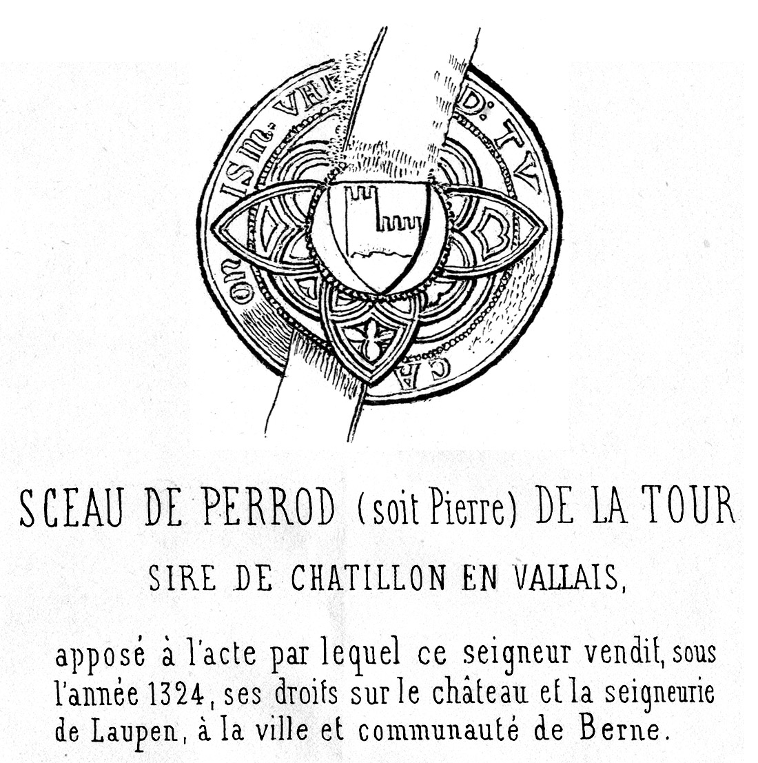 Nous rapporterons maintenant une donation de ce seigneur en faveur de la sacristie de l’abbaye de Saint-Maurice, par laquelle nous apprendrons de quelle manière la maison de la Tour est parvenue à la possession de la terre et seigneurie de Bex.