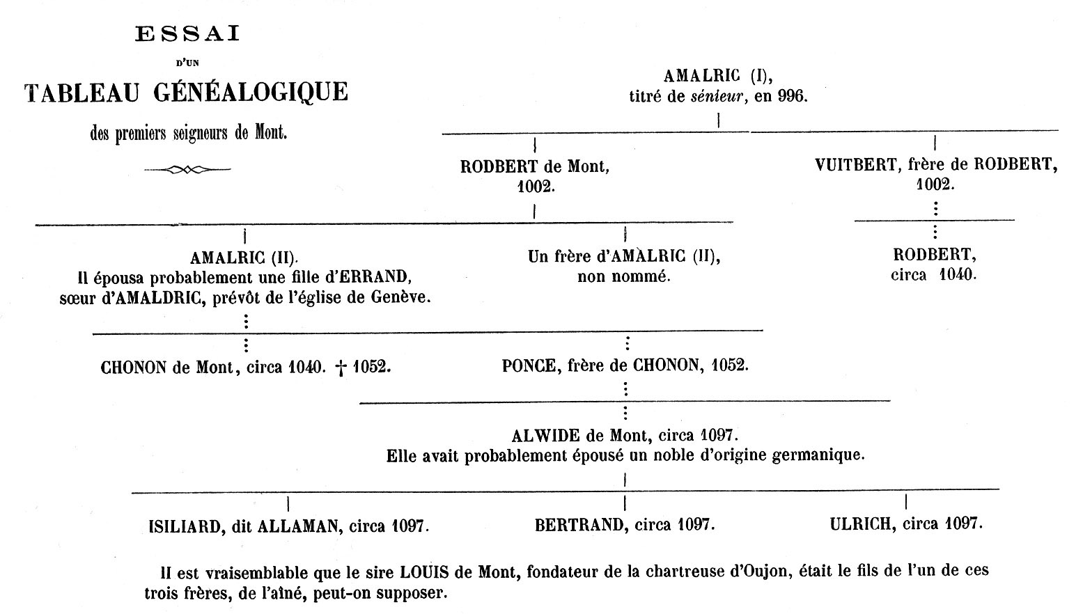 Voici maintenant les suppositions que nous suggère la lecture du document dont nous venons de rapporter les dispositions; nous les donnons ici à ce simple titre : Alwide de Mont aurait été l’héritière des seigneurs de ce nom et la fille de Ponce, qui fit une donation importante, en faveur du couvent de Romainmotier, en l’année 1052, pour l’âme de son défunt frère Conon (de Mont). Alwide aurait épousé quelque noble d’origine germanique, ce que ferait supposer le surnom d’Allaman, porté par Isiliard, son fils aîné. Le sire Louis de Mont, fondateur de la chartreuse d’Oujon, aurait eu pour père l’un des fils d’Alwide de Mont, l’aîné de ceux-ci, peut-on supposer, et la dite Alwide aurait ainsi formé le chaînon intermédiaire rattachant la seconde race des seigneurs de Mont à la première. Il ne faut pas perdre de vue que le fils aîné de /468/ Louis de Mont se nomma Conon et le second Amalric soit Amauri 1 , deux prénoms que l’on retrouve chez les anciens seigneurs de Mont.
