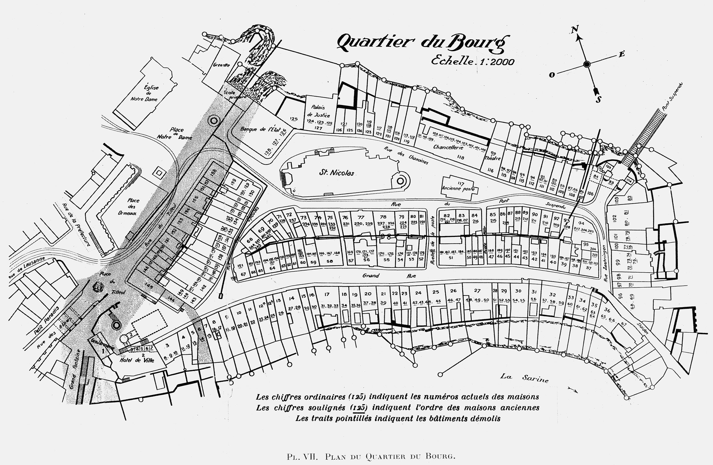 Cette étude devait, primitivement, être complétée par une troisième partie, dans laquelle je faisais l’historique de toutes les maisons du quartier du Bourg, depuis le milieu du XIVe siècle ou le début du XVe jusqu’au début du XVIIe siècle, c’est-à-dire jusqu’au moment où nous avons, par la perspective de Martin Martini, en 1606, un document iconographique nous permettant de nous faire une idée exacte de ce qu’était ce quartier, à cette époque.