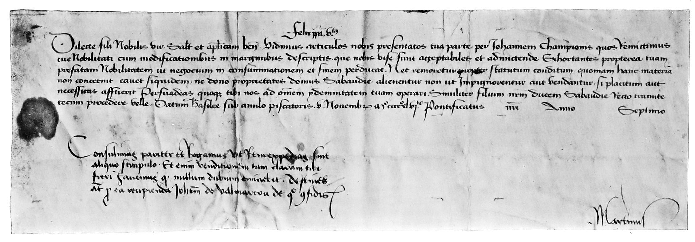 Per dominum presentibus reverendo domino cardinali de Chippro 1, necnon dominis Petro Marchiandi, cancellario; Johanne domino Bariatti, marescallo Sabaudie; Johanne domino Choutaignie; Guillermo domino Menthonis; Jacobo domino, Montismaioris; Guigone de Rovorea, domino Cursingii; Jacobo de Claromonte; Jacobo de Turre; Guilliermo de Conflentia, advocato fiscalli; Guilliermo de Viriaco, magistro hospitii, et Johanne Marescalci, thesaurario.