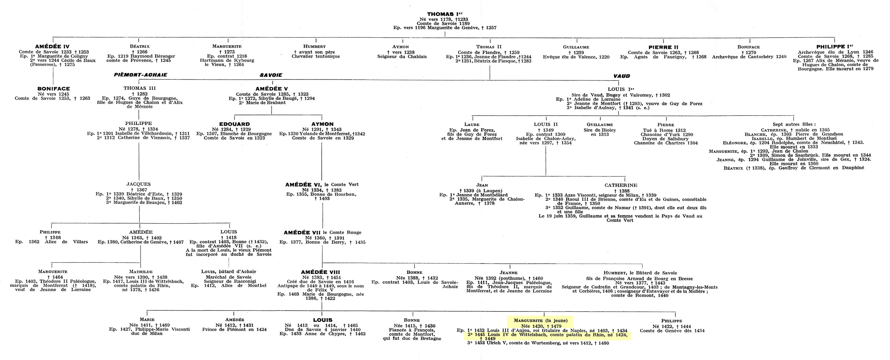 Ce dernier appartenait à la maison de Wittelsbach, dont la branche aînée régnait dans le Palatinat et la branche cadette 2 en Bavière, bien plus restreinte que maintenant. Le Palatinat d’alors, à la différence du Palatinat actuel, s’étendait sur les deux rives du Rhin, avec Heidelberg comme capitale. Un membre de cette famille, Robert 3, avait été placé à la tête de l’empire comme roi des Romains de 1400 à 1410. Ses possessions héréditaires avaient été partagées entre ses quatre fils : Louis, Jean, Etienne et Othon. L’aîné Louis III 4, outre la dignité électorale, avait eu la plus grande partie du Palatinat rhénan et du Haut-Palatinat. /21/ Il avait déjà épousé en secondes noces une princesse de la maison de Savoie, Mathilde 1 fille d’Amédée de la branche d’Achaïe. C’est son fils, Louis IV, qui est fiancé en 1444 à Marguerite de Savoie 2. /22/