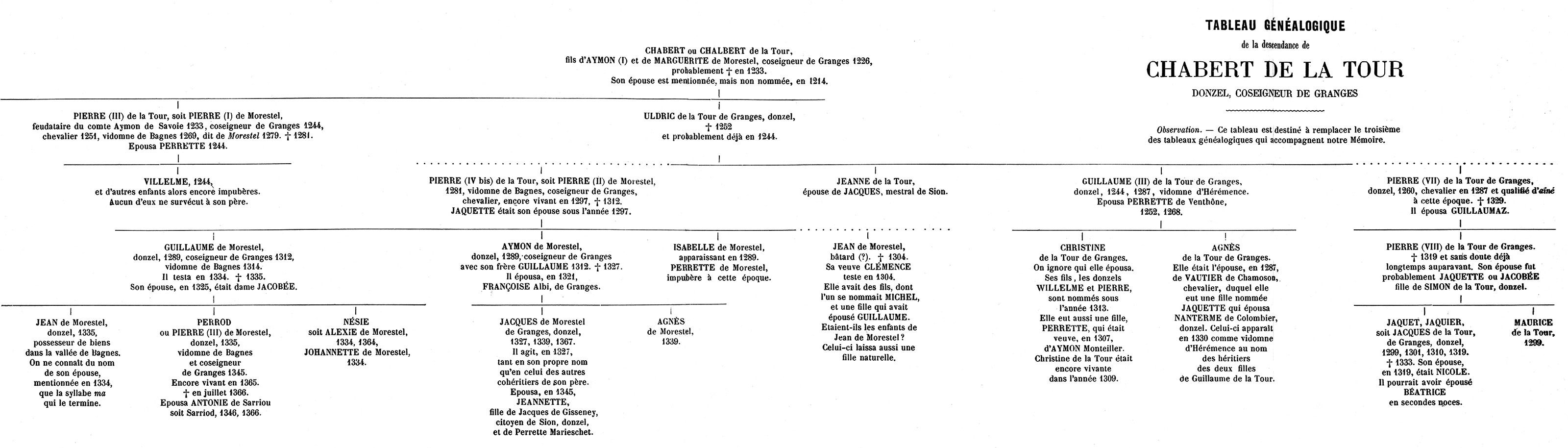 Il règne quelque obscurité à l’égard de la filiation de la descendance du donzel Uldric de la Tour, et cela par suite de l’absence de documents. Nous n’avons pas trouvé d’éclaircissements sur ce point dans les nouvelles chartes qui nous ont été communiquées, quoique quelques-unes d’entre elles /174/ se rapportent au donzel Jaquet, soit Jacques de la Tour de Granges. Nous devons donc maintenir ici ce que nous avons avancé dans notre Mémoire, savoir que le donzel Jaquet était fils de Pierre de la Tour d’Ollon et de Jacobée, fille du donzel Symon de la Tour, de la branche aînée de la famille de ce nom, et que le précité Pierre de la Tour était fils d’un autre Pierre de la Tour, chevalier, dit l’aîné, fils, selon toute probabilité, du donzel Uldric de la Tour.